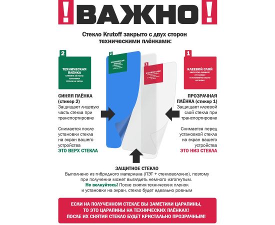 ГИБРИДНОЕ защитное стекло для камеры телефона сохраняет гибкость защитной пленки, и прочность стекла. Оно намного удобнее обычного закаленного стекла - как при транспортировке, так и при установке. Гибридное стекло тоньше, прочнее и надежно защищает смартфон от повреждений. Имеет высокую степень устойчивости к царапинам. Идеально прозрачное, не снижает четкость и яркость изображения, не меняет оригинальную цветопередачу. Изготовлено из гибкого композиционного материала (стекловолокно и ПЭТ). Гибридное стекло гибкое, оно не растрескивается и не крошится, как обычное закаленное стекло. Защищает от пыли, грязи, брызг и царапин. Полная проклейка поверхности (Full Glue). Специальная смесь высококачественных клеев гарантирует установку без пузырьков воздуха и что стекло не отслоится с течением времени. Внимание! Гибридное стекло поставляется в двух защитных транспортировочных пленках (на тыльной и лицевой стороне). Данные пленки могут быть поцарапаны. После наклеивания стекла снимите защитную синюю пленку "2" с лицевой стороны!