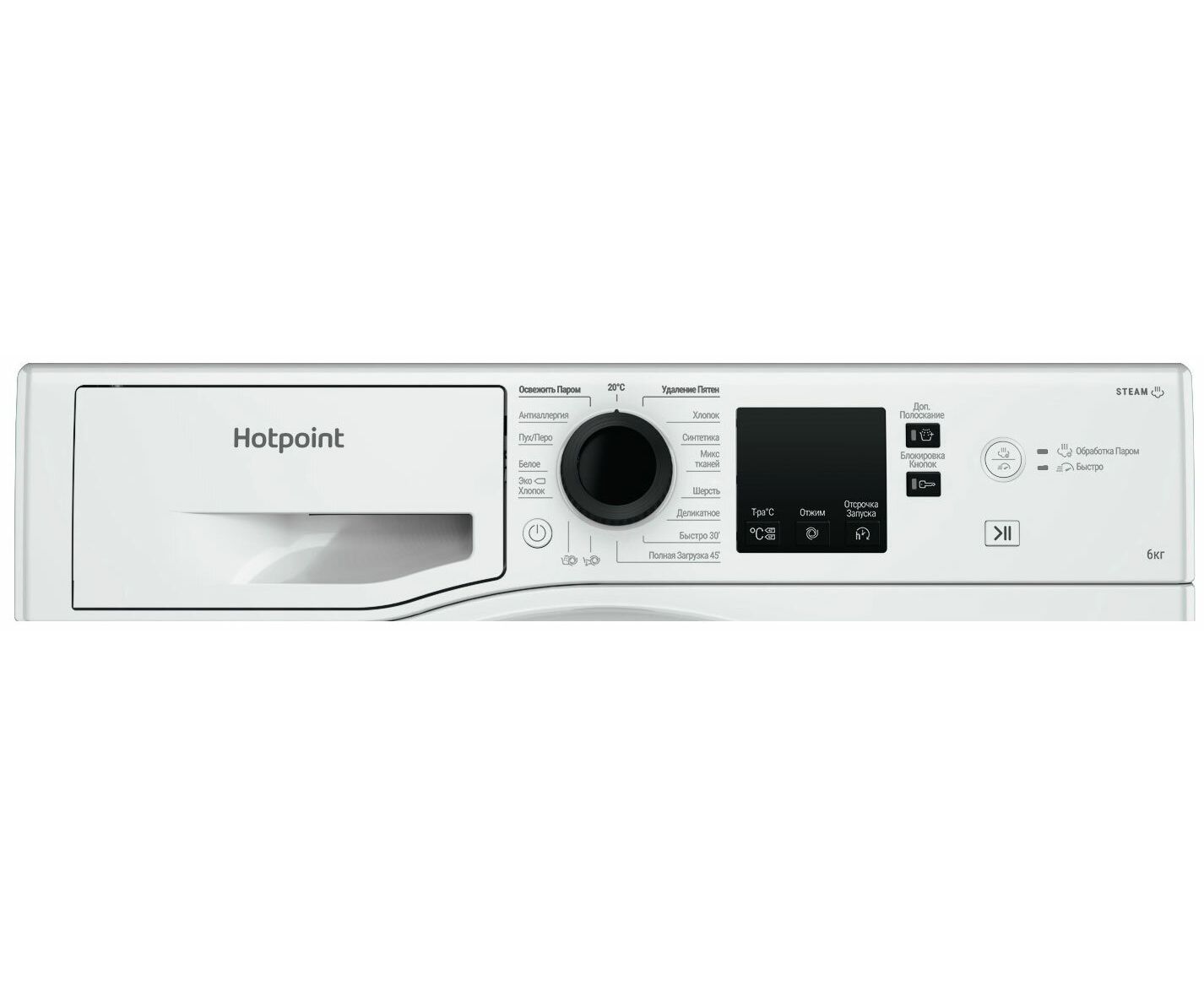 освежить паром, 20°C, удаление пятен, хлопок, синтетика, микс тканей, шерсть, деликатное, быстро 30’, полная загрузка 45’, антиаллергия, пух/перо, белое, эко хлопок