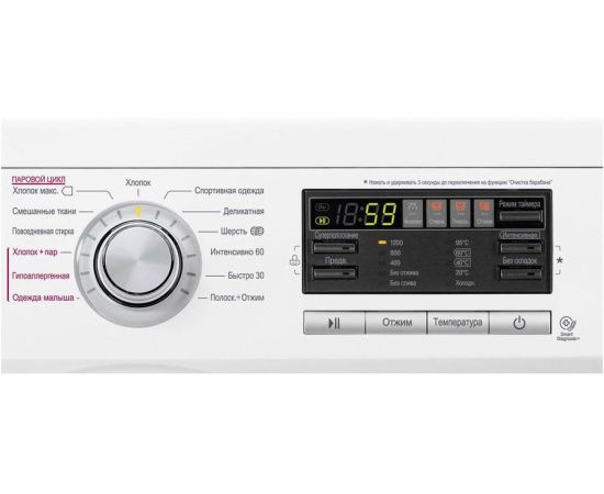 Программы Хлопок, Хлопок макс., Смешанные ткани, Повседневная стирка, Хлопок + Пар, Гипоаллергенная стирка, Одежда малыша, Спортивная одежда, Деликатная, Шерсть, Интенсивно 60, Быстро 30, Полоскание+Отжим
