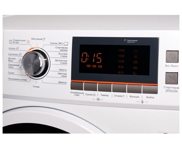 Программы: Хлопок, Синтетика, Детские вещи, Сушка, Сушка+Стирка 60мин., Смешанные ткани, Отжим, Мой режим, Хлопок ЭКО, Быстрая стирка, Деликатная стирка, Шерсть, Полоскание+Отжим, Джинсы, Цветные ткани, Спортивная одежда