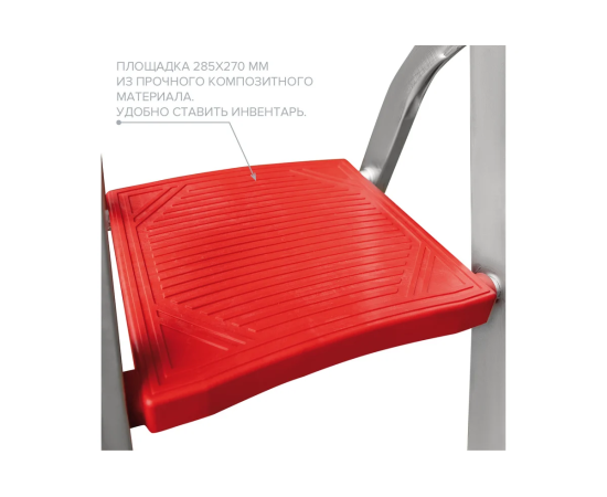 Стремянка Новая высота 6 ступеней с шириной 130 мм 5110106 позволяет комфортно работать на высоте. В конструкции предусмотрены пластиковые наконечники против скольжения. Рабочая сторона имеет клепаное соединение ступеней с боковинами, что обеспечивает надежность лестницы. Для защиты от расхождения используются ремни безопасности. Стремянка выдерживает нагрузку до 225 кг. Большая площадка 285х270мм из прочного композитного материала позволяет удобно ставить инвентарь.