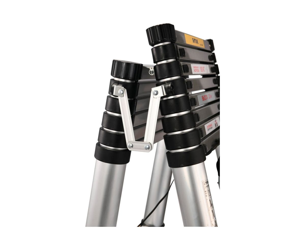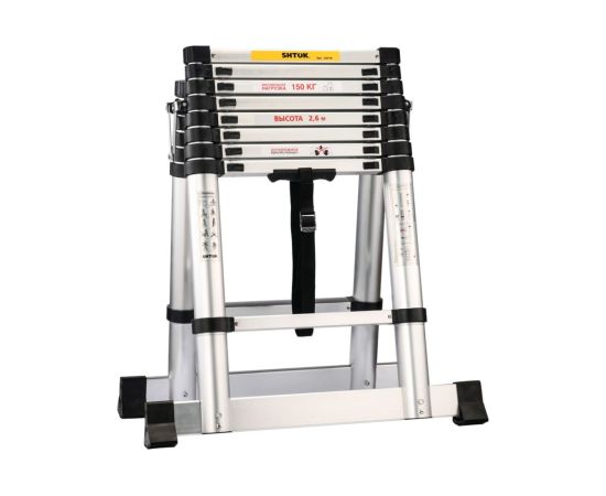 Телескопическая стремянка SHTOK 2.6м 20018 выдерживает нагрузку до 150 кг. За счет прочной конструкции из дюралюминия и первичного (переработанного) пластика обеспечивает надежность и долговечность использования. На стенде испытываемая стремянка выдерживает 10 000 циклов на раскрытие-закрытие.
