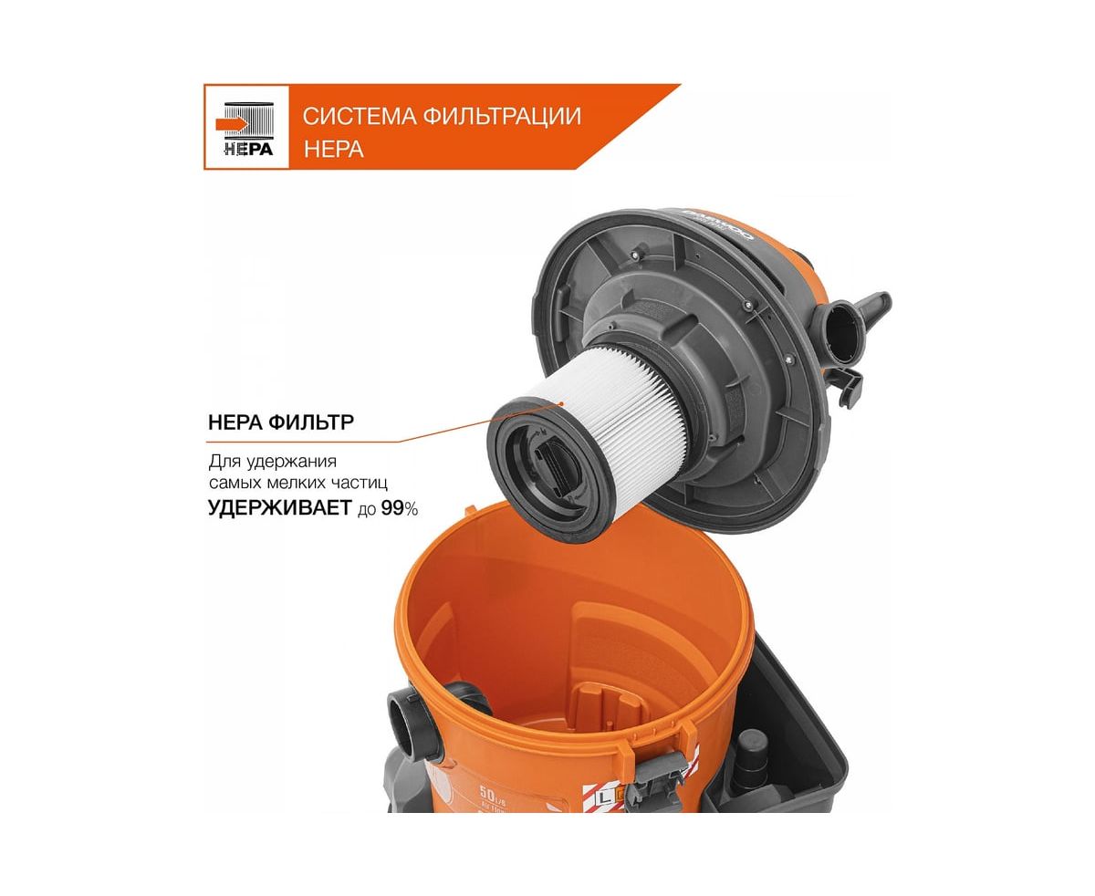Шланг длиной 3 м позволяет собирать строительный мусор на высоте, без необходимости поднимать пылесос.