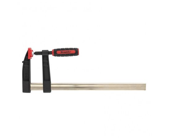 F-образная струбцина обеспечивает оптимальную силу сжатия, которая прижимает к верстаку детали либо удерживает их плотно сжатыми между собой. Для стягивания губок имеется удобная двухкомпонентная рукоятка.Прочный винт равномерно распределяет нагрузку по резьбе - исключает срыв. Штанга также выдерживает направленные нагрузки.
