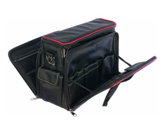 Сумка монтажника изготовлена из водонепроницаемого нейлона и обладает высокой прочностью. Имеет одно жесткое внутреннее отделение, два вместительных наружных кармана и откидывающиеся боковые секции с несколькими отделениями. Прошитые мягкие ручки обеспечивают удобство при переноске. Грузоподъемность сумки достигает 20 кг.
