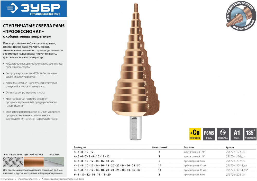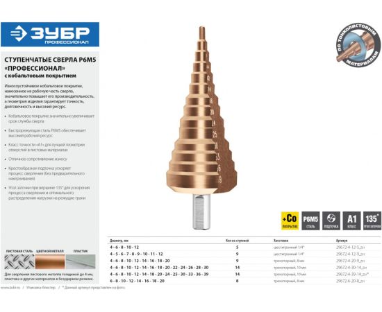 Описание: Ступенчатые сверла ЗУБР специально разработаны для поэтапного сверления отверстий большого диаметра в различных металлических конструкциях и заготовках.