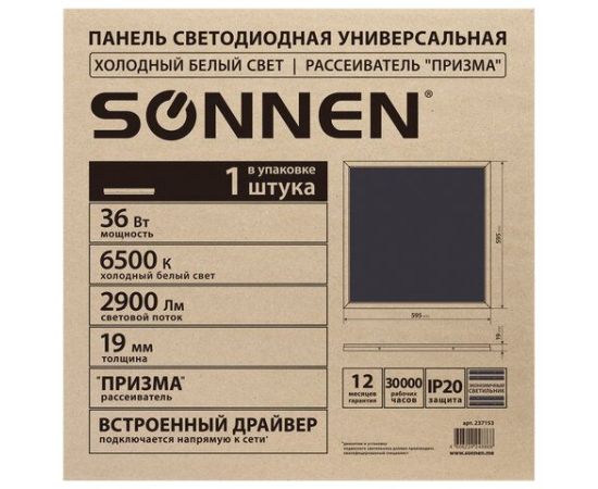 Светильник светодиодный SONNEN 237153 Эко 6500K, холодный белый, 595х595х19мм, 36Вт, прозрачный