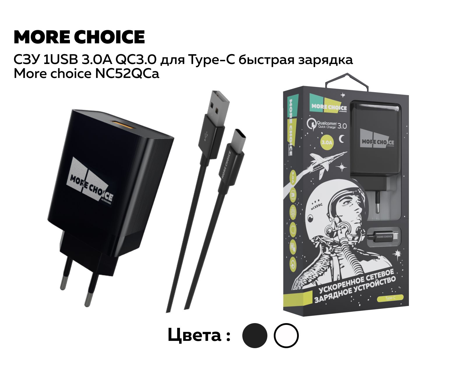 СЗУ 1USB 3.0A QC3.0 для Type-C быстрая зарядка More choice NC52QCa (Black)