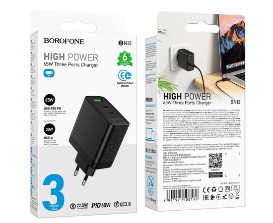 СЗУ BOROFONE BN12 Manager PD65W three-port(2C1A) charger(EU) (черный)