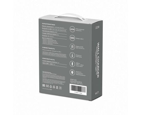 Сетевое зарядное устройство BREAKING WC17 выполнено из ударопрочного ABS-пластика. Модель рассчитана на входное напряжение 100-240V и обеспечивает выходную мощность до 45W и выходной ток до 3.0A. Блок с одним разъемом USB-C. Модель поддерживает технологию быстрой зарядки Power Delivery и позволяет зарядить смартфон до 75% всего за 25 мин! Также, зарядное устройство поддерживает функцию защиты от перегрузок, короткого замыкания, импульсивного перенапряжения.