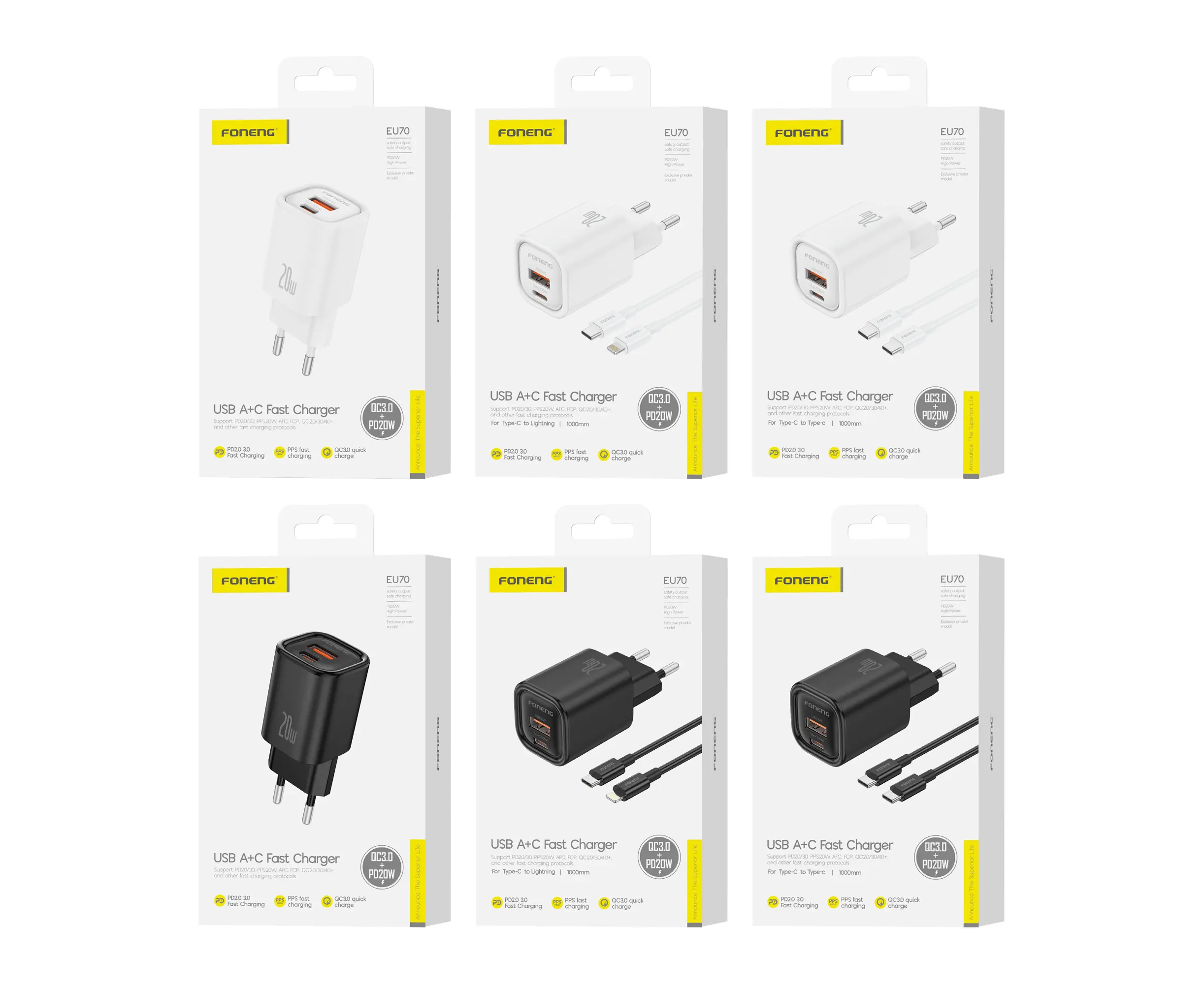 СЗУ Foneng EU70 USB-A / USB-C, PD20W + кабель Type-C to Type-C (White)