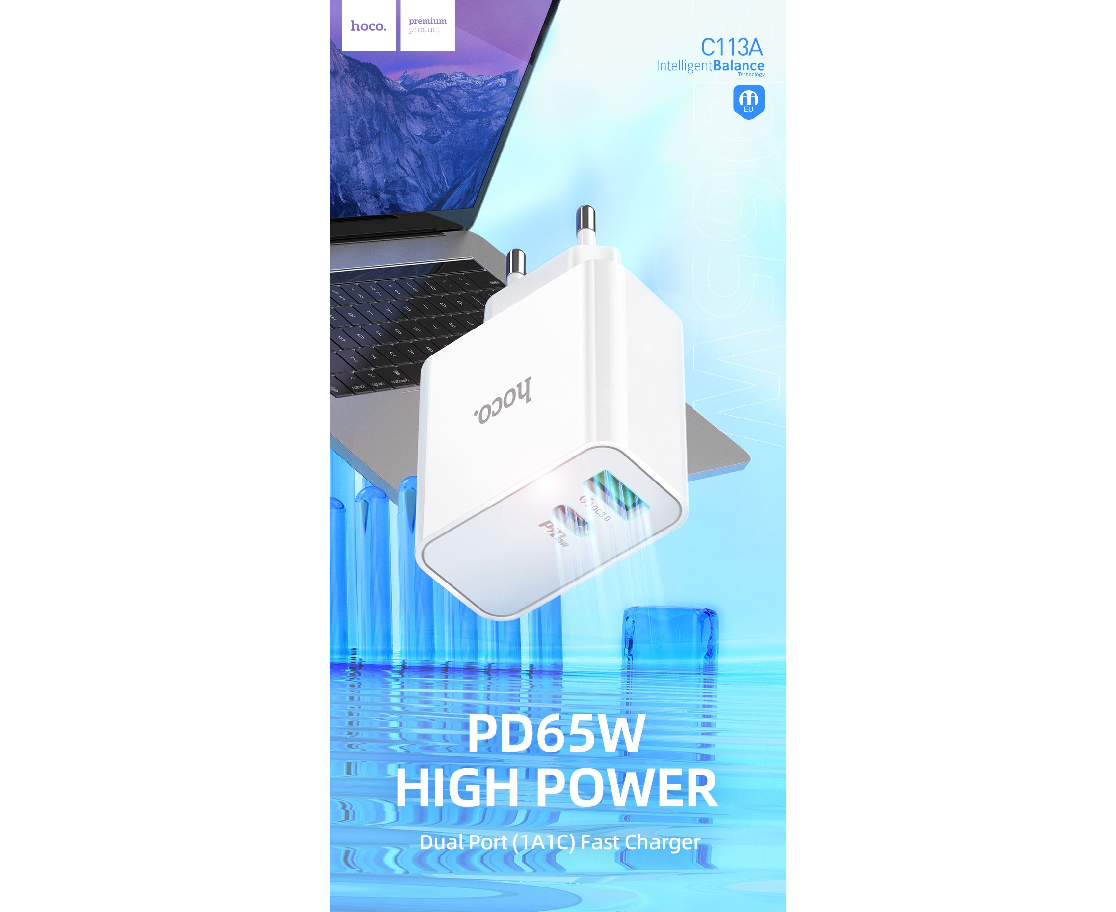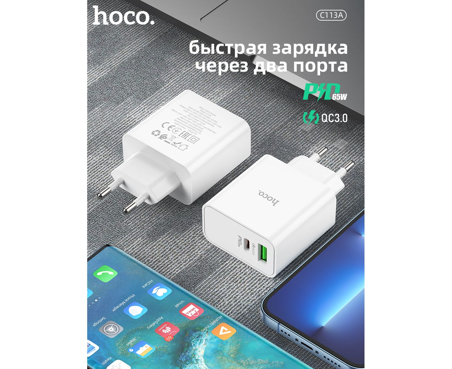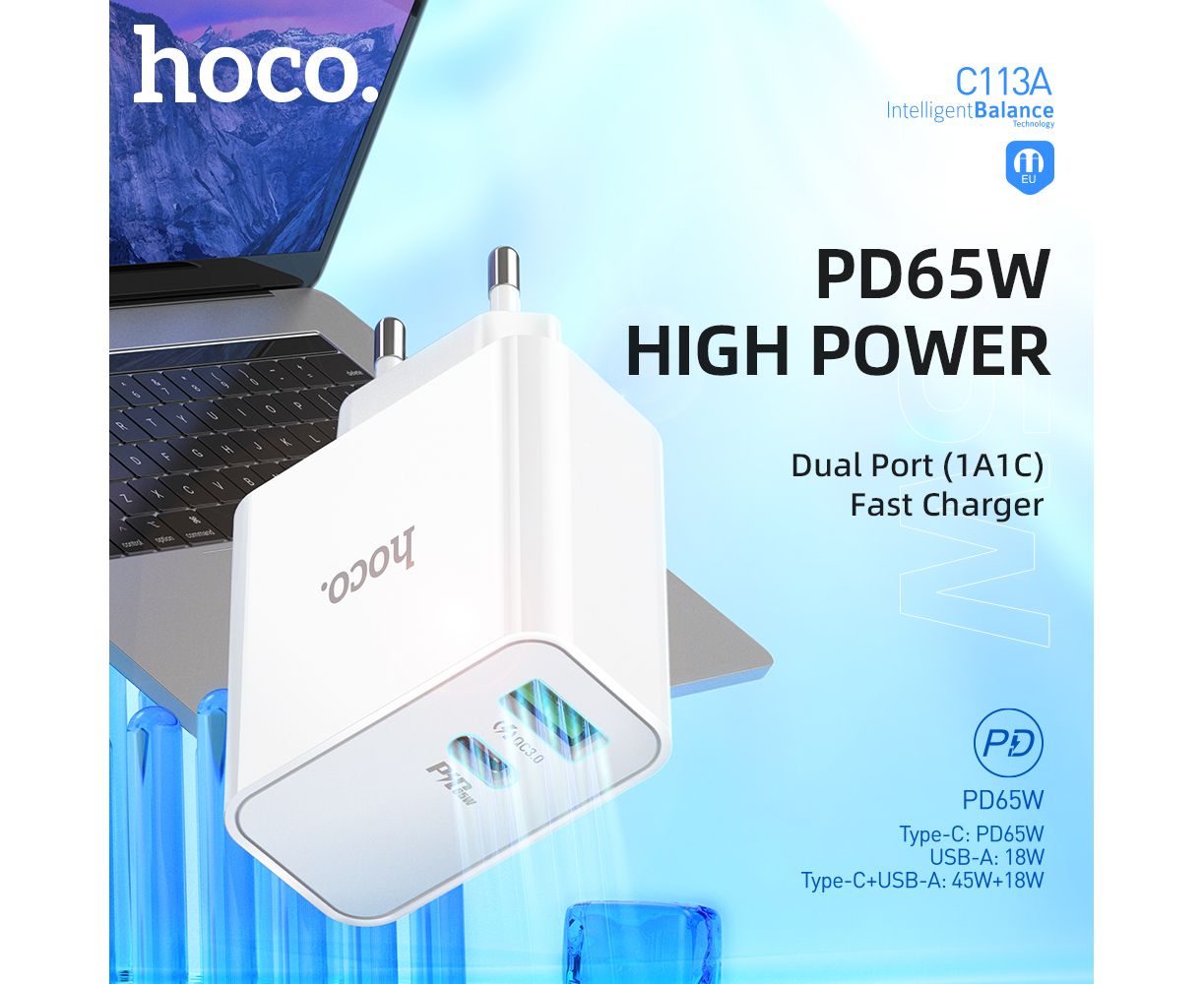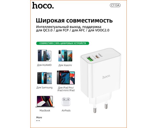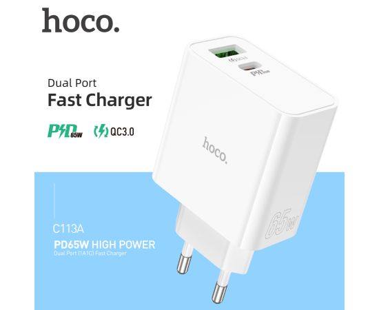 СЗУ HOCO C113A Аwesome 2USB, PD65W, 1A1C, (EU) (белый)