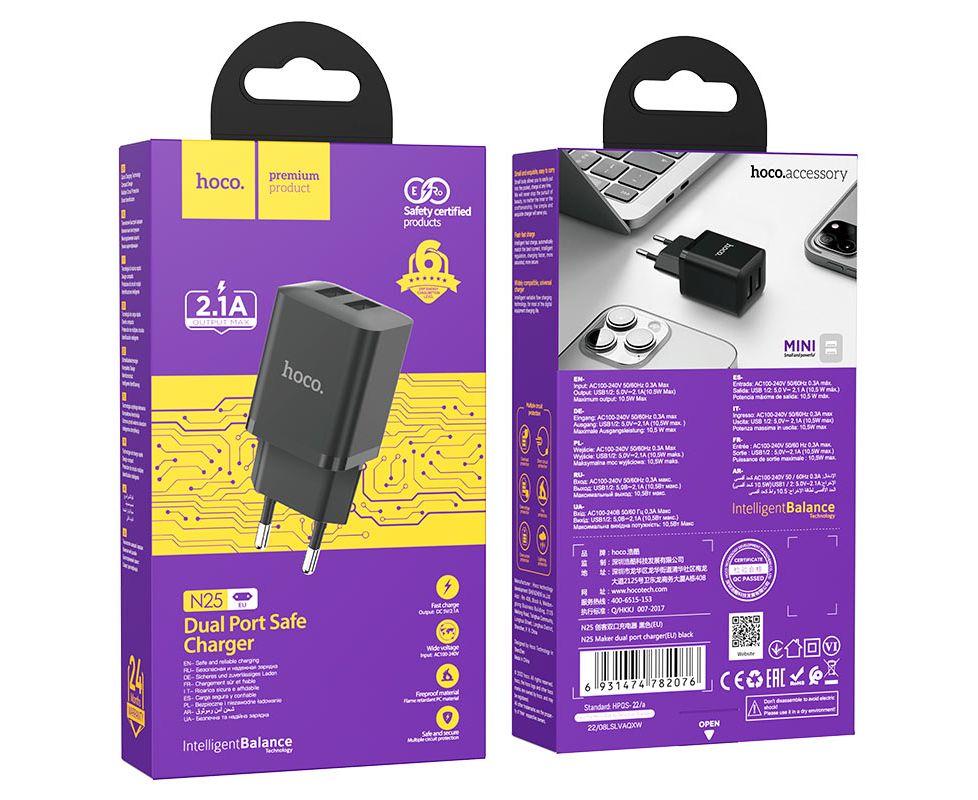 СЗУ HOCO N25 Maker, 2USB, 5V, 2.1A + lightning (черный)