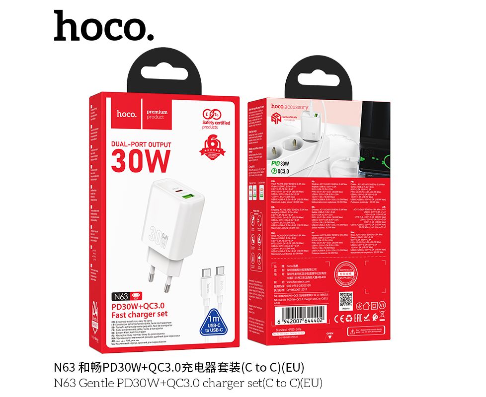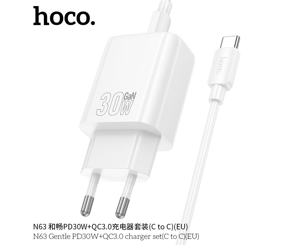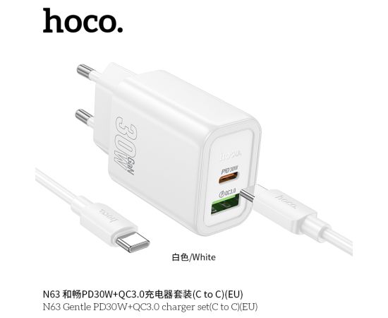 СЗУ HOCO N63 Gentle PD30W+QC3.0 cabel Type-C to Type-C (белый)
