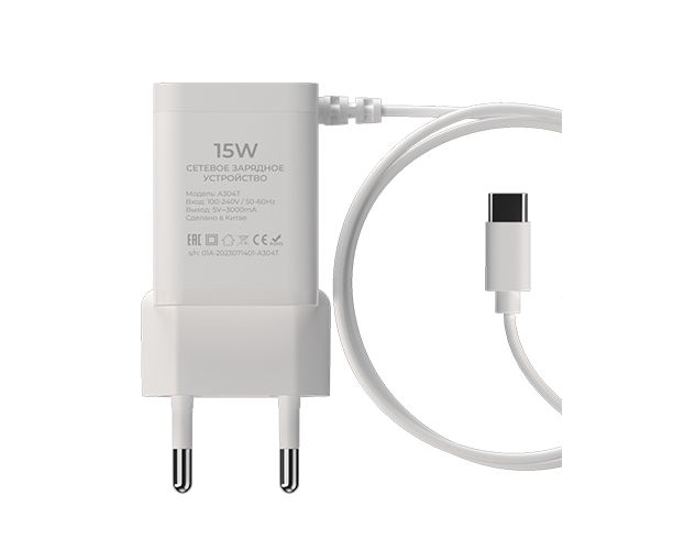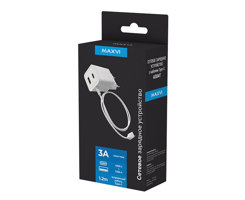 СЗУ Maxvi A304T Type-CUSB 3A 15W + литой кабель Type-C 1.2м white