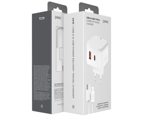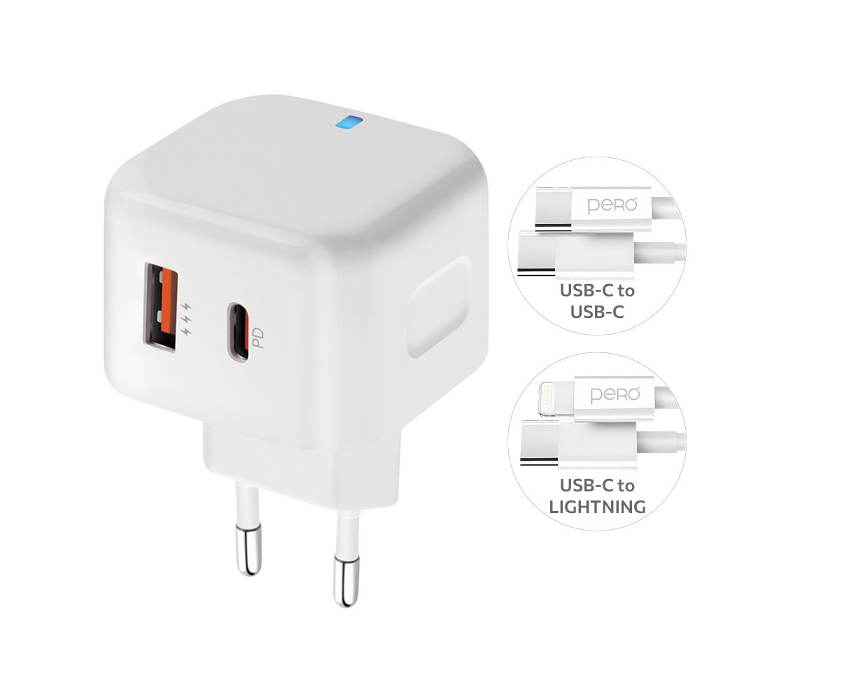 Сетевое зарядное устройство PERO TC11 оснащено 2-мя USB-портами — USB-А с выходным током до 3А и USB Type-C с функцией быстрой зарядки Power Delivery, мощностью 45W. СЗУ имеет функцию fast charge и защиту от перегрузок и перегрева.