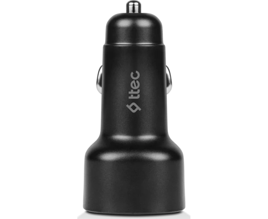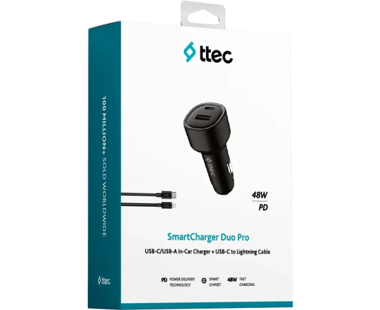 TTEC SmartCharger Duo PD 48W Vehicle Fast Charger USB-C+USB-A With USB-C-Lightning Cable - Black