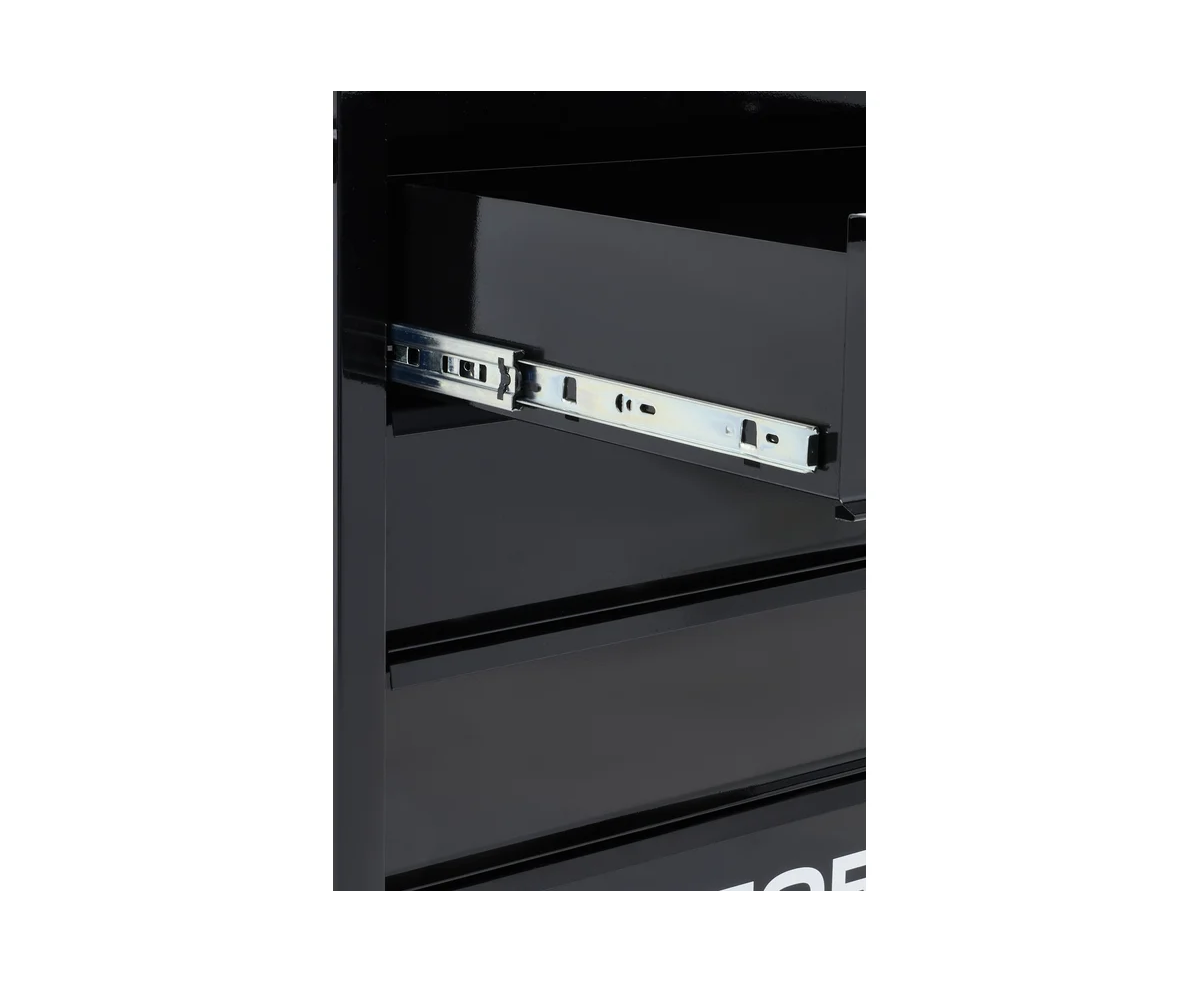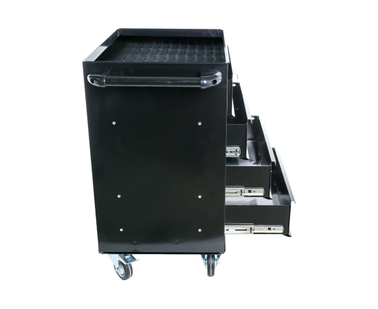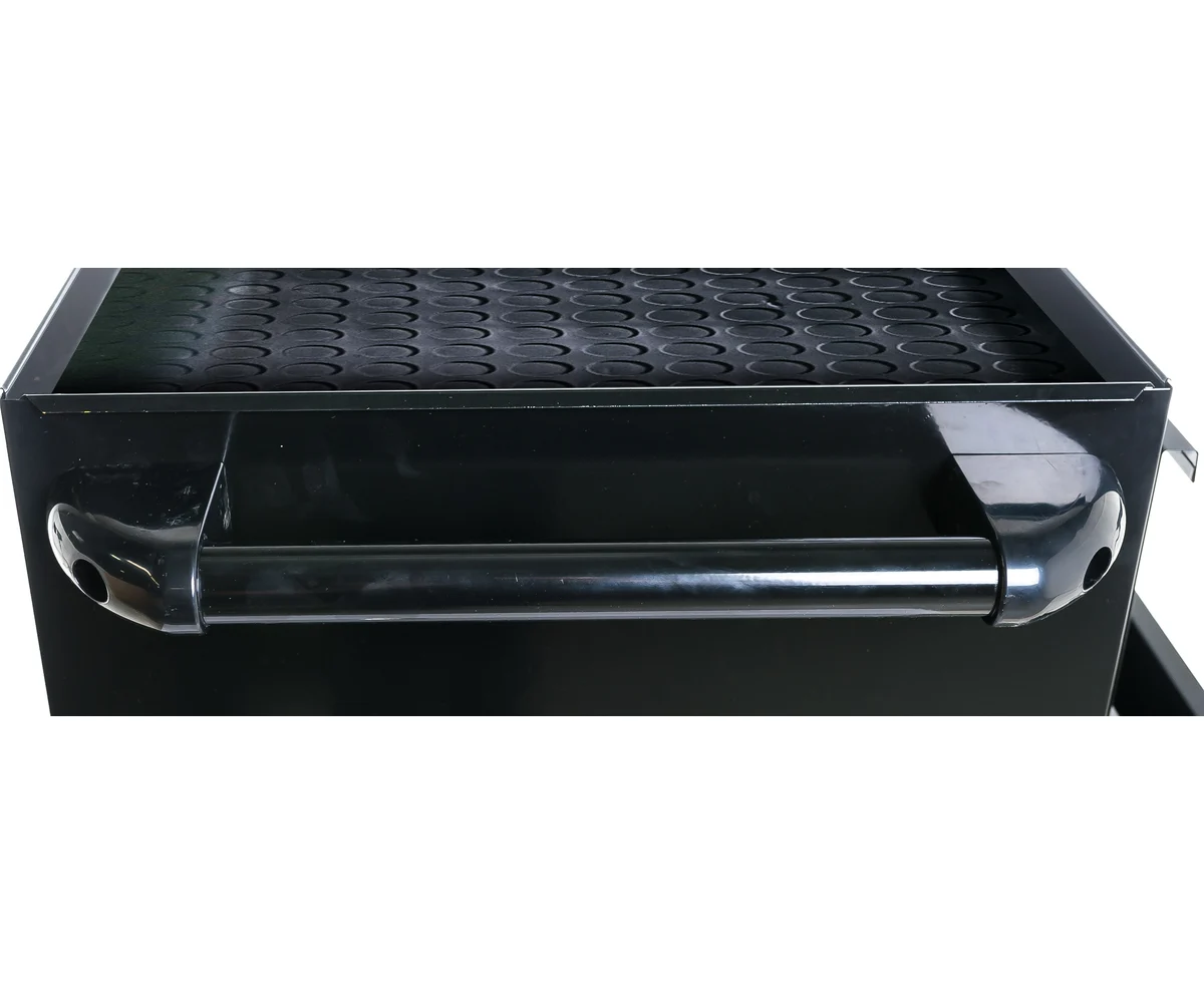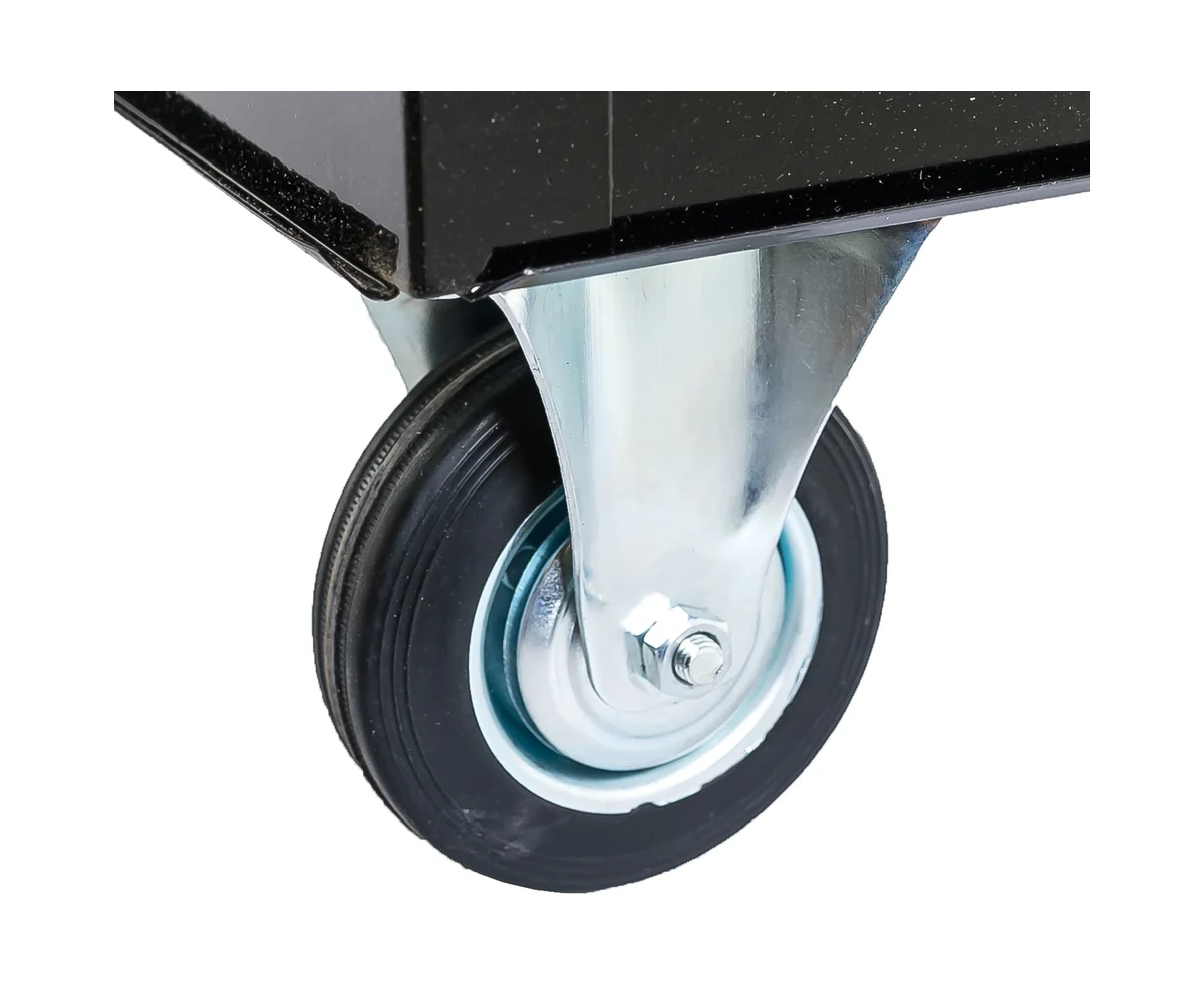 С помощью колес и ручки тележка легко и быстро перемещается по рабочей площадке. Верх конструкции покрыт резиновым материалом, который препятствует скольжению рабочего инструмента. Максимальная нагрузка на ящик - 30 кг. Толщина металла составляет 0.8 мм.