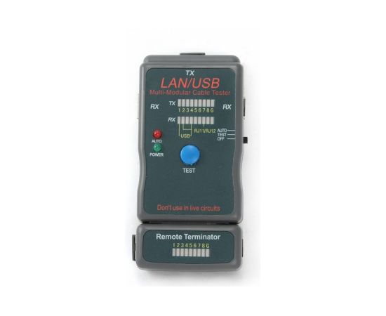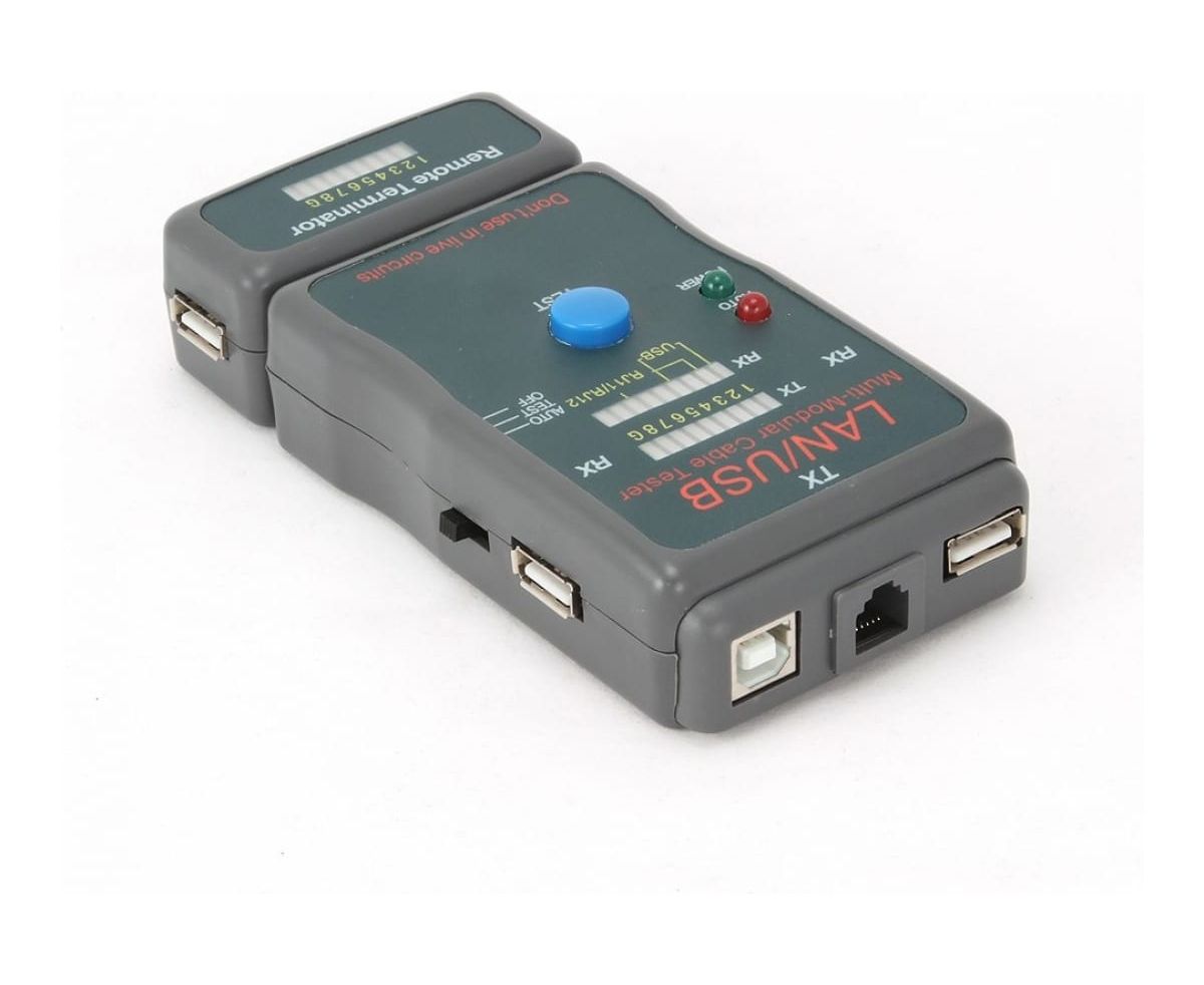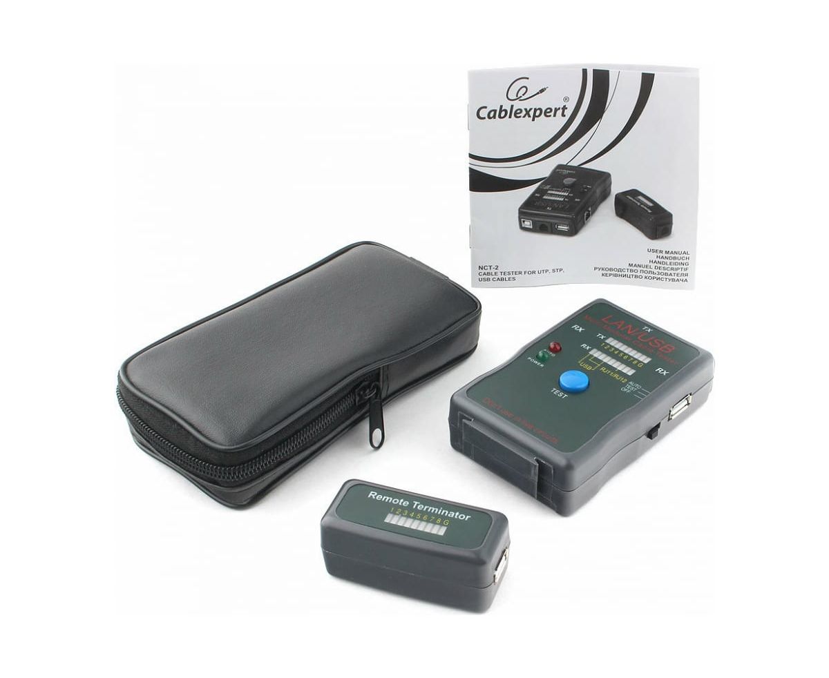 Тестер Cablexpert LAN 100/1000 Base-TX, для UTP, STP, RJ-11, USB-кабеля NCT-2 помогает быстро определить неисправность в кабельной сети, протестировать кабель на обрыв, замыкание, проверить целостность экрана и правильность разводки кабеля.