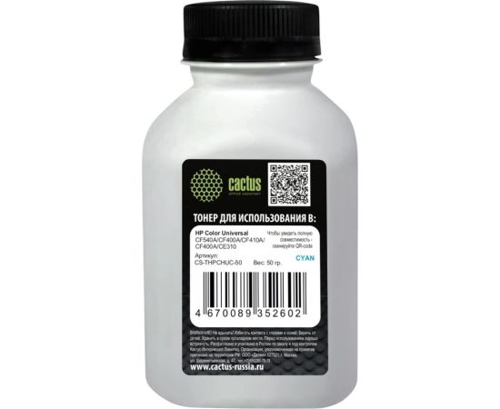 Тонер Cactus CS-THPCHUС-50 голубой флакон 50гр для принтера HP Color Universal CF540A/CF400A/CF410A/CF400A/CE310
