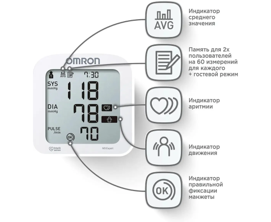 Технология интеллектуального измерения Intellisense, Индикатор движения, Расчет среднего значения, Индикатор правильной фиксации манжеты, Графический индикатор уровня артериального давления, Память для 2 пользователей, OMRON connect, Клинически апробирован, Мини-адаптер в комплекте