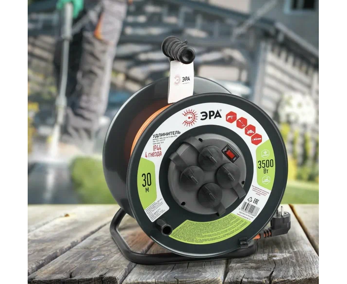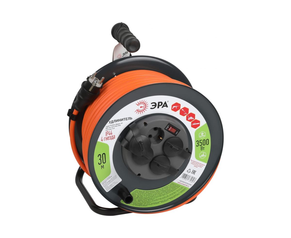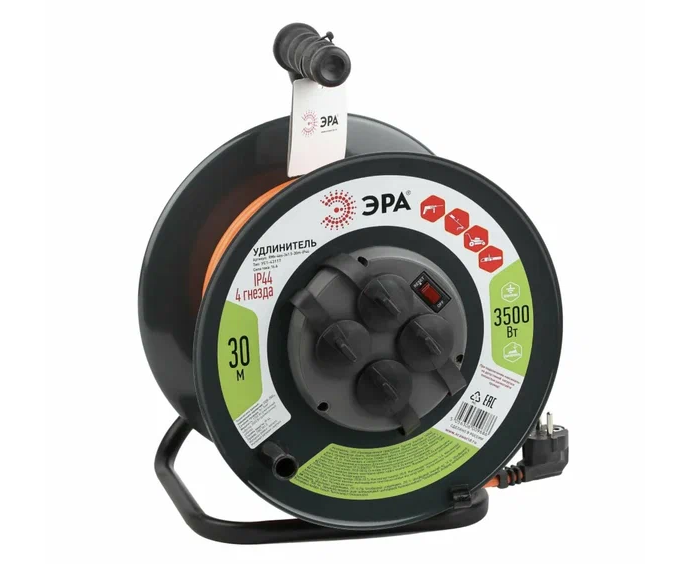 Удлинитель силовой ЭРА RMx-4es-3x2.5-30m-IP44 Б0052920 на металлической катушке с заземлением с выключателем 4 розетки 30м ПВС
