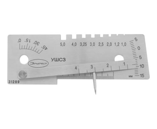 Универсальный шаблон сварщика УШС-3 (альтернативное название — универсальный шаблон сварщика УШС-3М) предназначен для визуального и измерительного контроля стыкуемых деталей, параметров стыкового шва и дефектов. Крупные шкалы шаблона обеспечивают удобство считывания показаний. Острый наконечник измерительного движка шаблона отлично подходит для измерения вогнутости корня стыкового шва и глубины подрезов, а пазы на основании шаблона позволяют оперативно определить диаметр электродов или сварочной проволоки непосредственно на месте проведения работ.