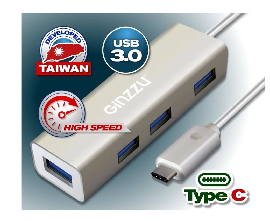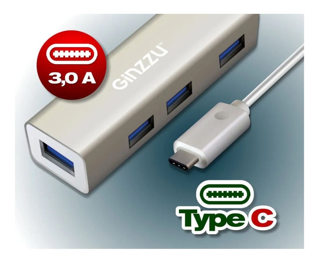 Концентратор Ginzzu GR-518UB OTG Type C! 4-х портовый USB 3.0 OTG Type C концентратор, интерфейс USB 3.1 Type C, кабель - 20 см, алюминиевый корпус. Интерфейсный кабель USB3.0 длиной 20 см. Скорость передачи данных до 5Gbps. Корпус - металлический.