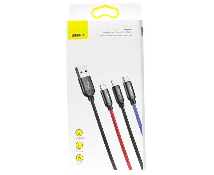 Мульти-кабель Baseus CAMLT-BSY01 - позволяет подключать к зарядному устройству одновременно до 3 устройств с разными интерфейсами. Оснащенный на одном конце входящим коннектором USB Type-A на другом конце данный аксессуар имеет три ветки провода с интерфейсами Lightning, microUSB и Type-C. Поэтому воспользоваться данным аксессуаром для зарядки своих мобильных девайсов могут как владельцы iPhone, так и пользователи гаджетов на Android. Правда пользователям "яблока" производитель данного изделия предоставил также и возможность синхронизации гаджета с компьютером со скоростью передачи данных до 480 Мбит/сек., тогда как по двум другим веткам кабеля возможна только зарядка. Кабель быстро заряжает технику, позволяя пропускать через себя ток с максимальной силой 3.5A, что вполне достойный показатель для мобильной техники. Преимуществом продукции Baseus является забота о безопасности устройств потребителей их продукции.