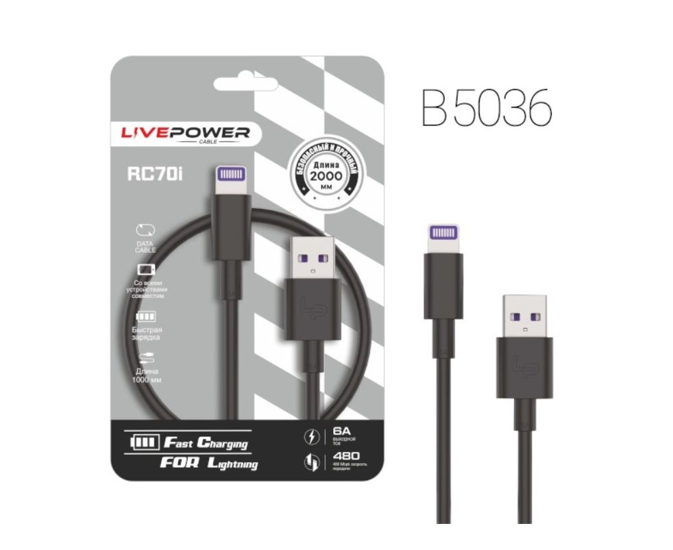 USB-кабель Live-Power RC70 Lightning 6A 2000mm Black 10шт в упаковке