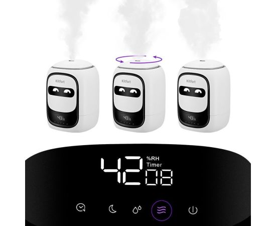 Вы можете задавать желаемый уровень влажности от 40 до 90% с шагом 5%, а также время работы увлажнителя - от 1 до 12 ч с шагом 1 ч. На дисплее отображаются текущая влажность и таймер. Вы можете выключить дисплей, воспользовавшись кнопкой “Ночной режим”.