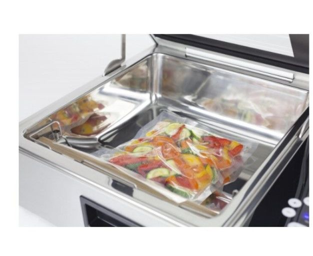 VacuChef Slimline - премиальное устройство компании Caso, который сочетает в себе компактный размер и плоскую форму, экономя место на вашей кухне, и характеристики лучших моделей линейки VacuChef . Корпус и внутренняя камера прибора изготовлены из прочной нержавеющей стали, верхняя крышка сделана из закаленного стекла для того, что вы могли следить за процессом вакуумирования, объем внутренней камеры около 8 л.