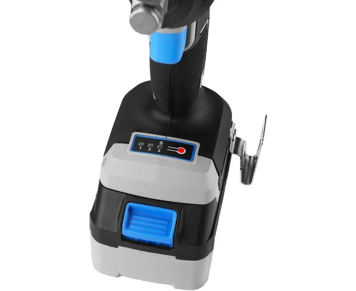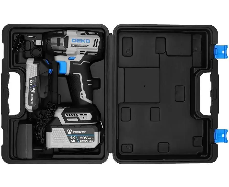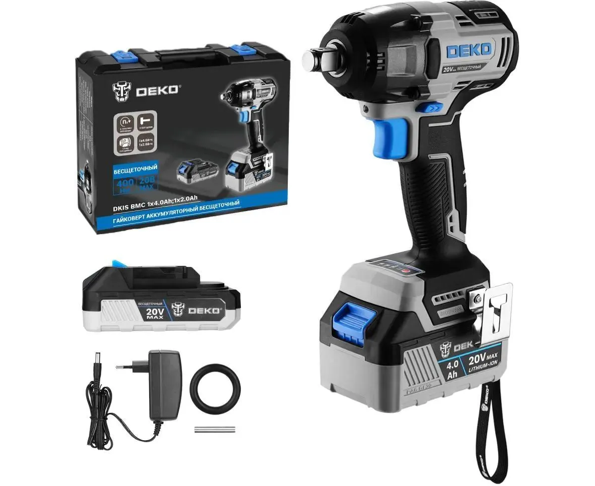 Гайковерт, 2 шт. АКБ, зарядное устройство, скоба поясная, саморез, уплотнительное кольцо, штифт, руководство по эксплуатации, кейс.