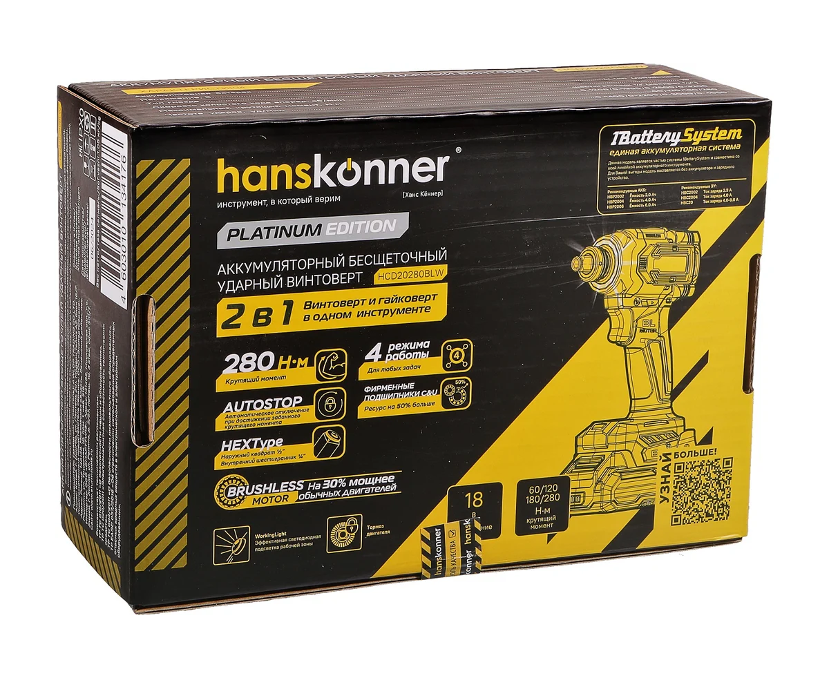 Винтоверт Hanskonner Platinum HCD20280BLW (удар б/щ 18В, 1BatterySystem, 2в1, 280Нм,, без АКБ и ЗУ)