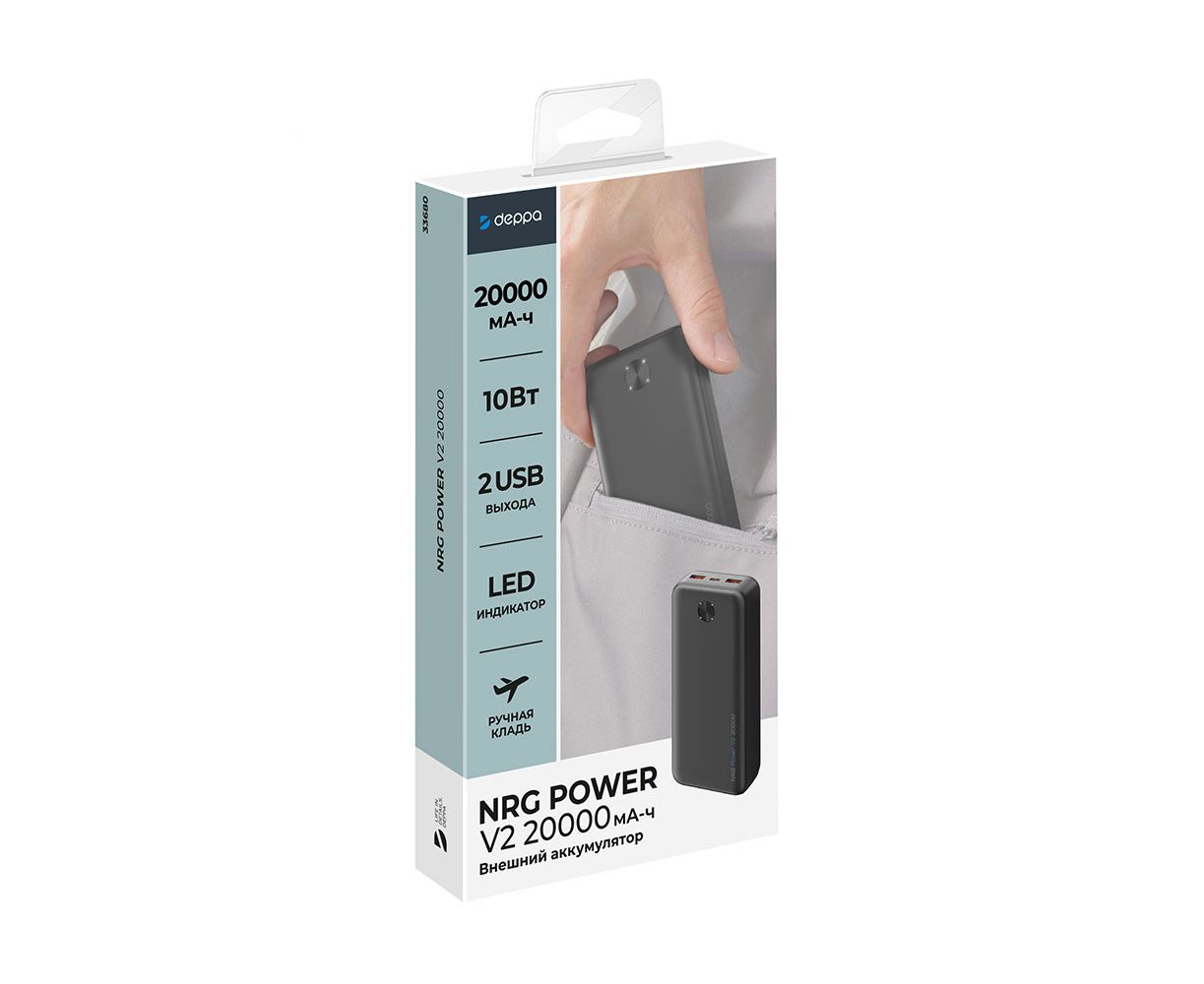Внешний АКБ NRG Power V2 20000 мА-ч, 2A, 2xUSB, черный, Deppa