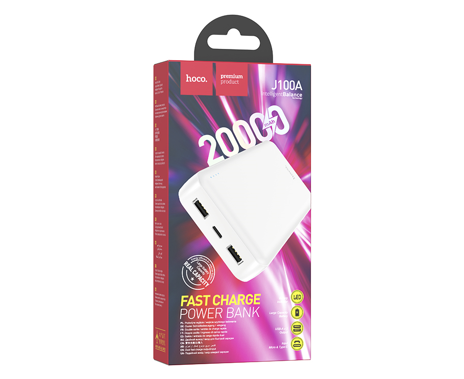 Универсальный внешний аккумулятор дает возможность многократно заряжать телефон и другие гаджеты без доступа к розетке и электрической сети. Ёмкость аккумулятора составляет 20000 mAh. Изготовлен из качественных и прочных материалов: пластика и поликарбоната, устойчивого к воздействию высоких температур. Оснащен двумя USB портами, что дает возможность заряжать два устройства одновременно. Напряжение на входе 5V. Сила тока на выходе 2.1 А. Корпус выполнен из высококачественного огнеупорного пластика. Hoco J100A имеет достаточно компактные размеры, поэтому устройство будет удобно брать с собой куда угодно. Выполнен в двух цветах.