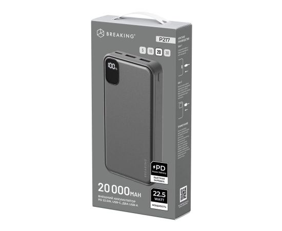Внешний аккумулятор Breaking P217, 2USB-A + USB-C, 20 000 mAh, 3.0A, 22.5W, PD, LED (Графит)