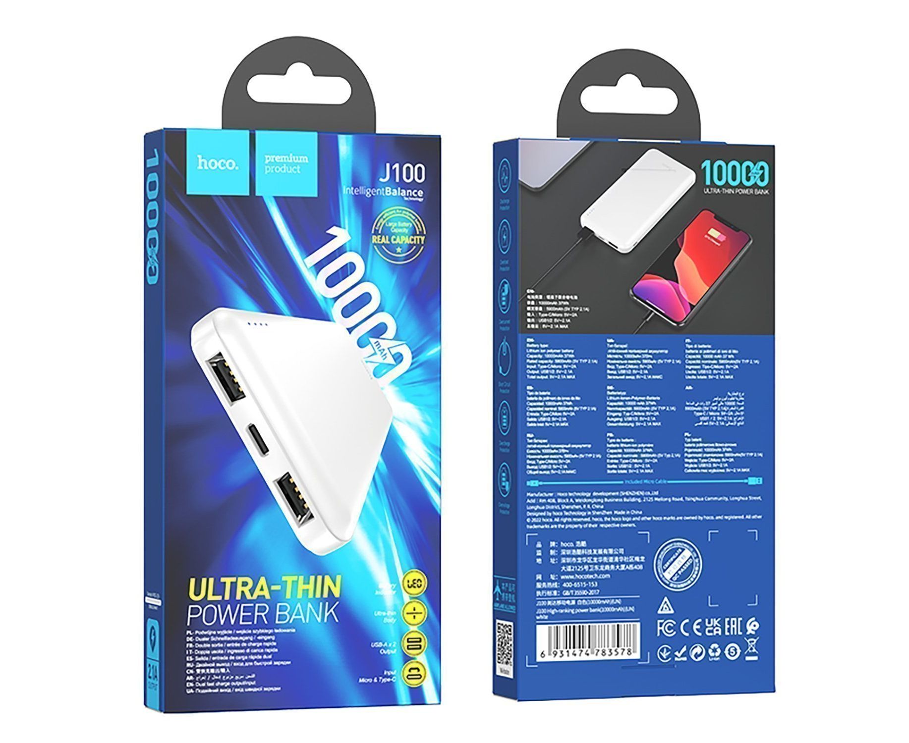 Внешний аккумулятор Hoco J100 10000mAh Micro/Type-C/USB*2 (white)(243576)