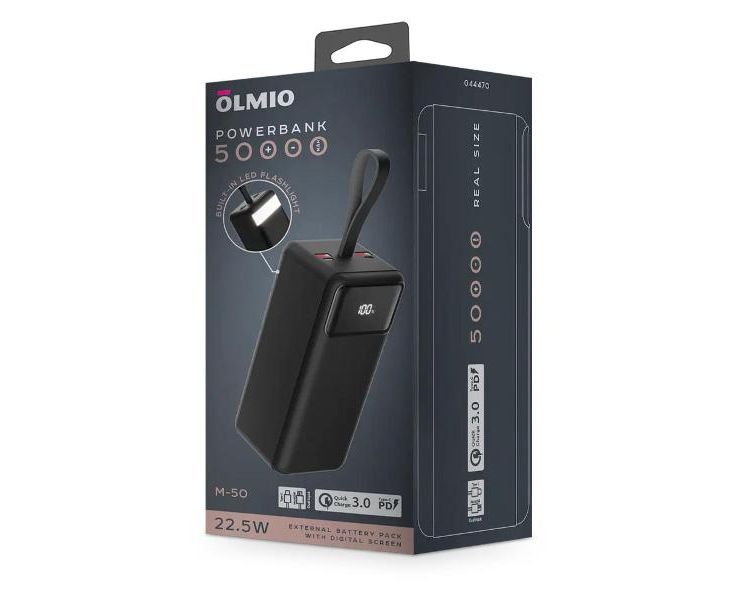 Внешний аккумулятор OLMIO M-50, 50000mAh, 22.5W, QuickCharge3.0/PowerDelivery, LCD, фонарик черный