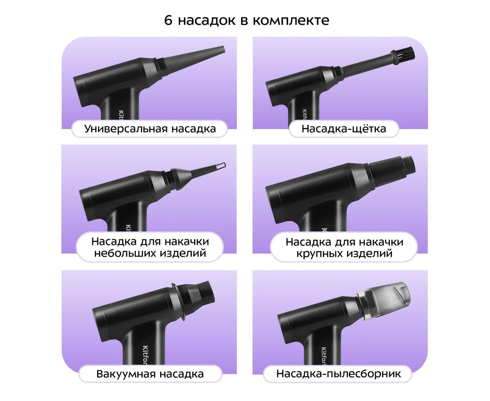 6 насадок в комплекте: универсальная, удлиненная, насадка-щетка, для накачки небольших и крупных надувных изделий, вакуумная насадка.