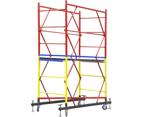 За счет ширины базового блока на ней комфортно работать сразу нескольким людям, разместив весь необходимый инструмент и материалы. Легко собирается без необходимости использования специального инструмента (все элементы соединяются флажковыми механизмами). Ее просто перемещать по объекту за счет наличия больших прорезиненных колес, которые также снабжены фиксаторами положения.