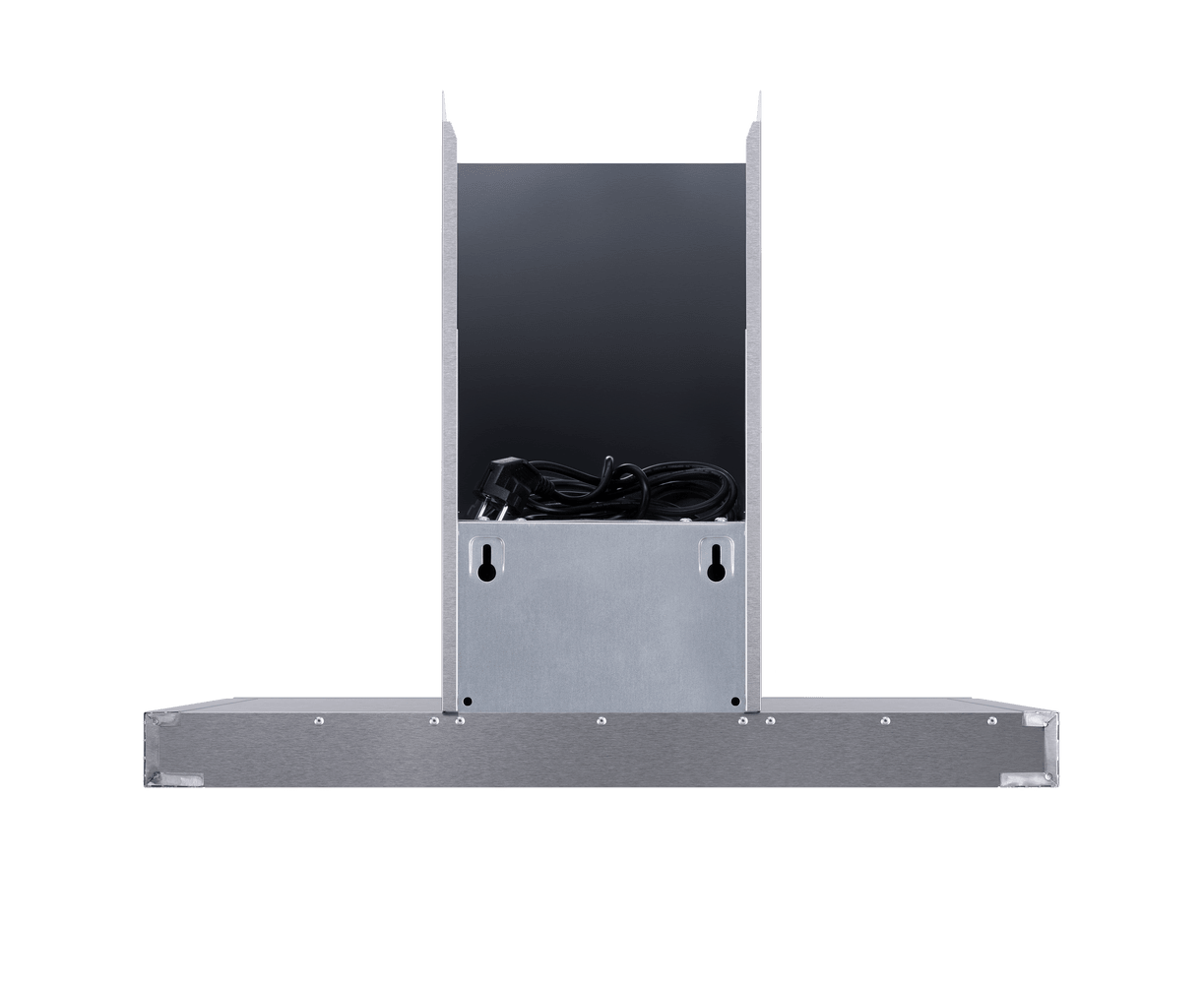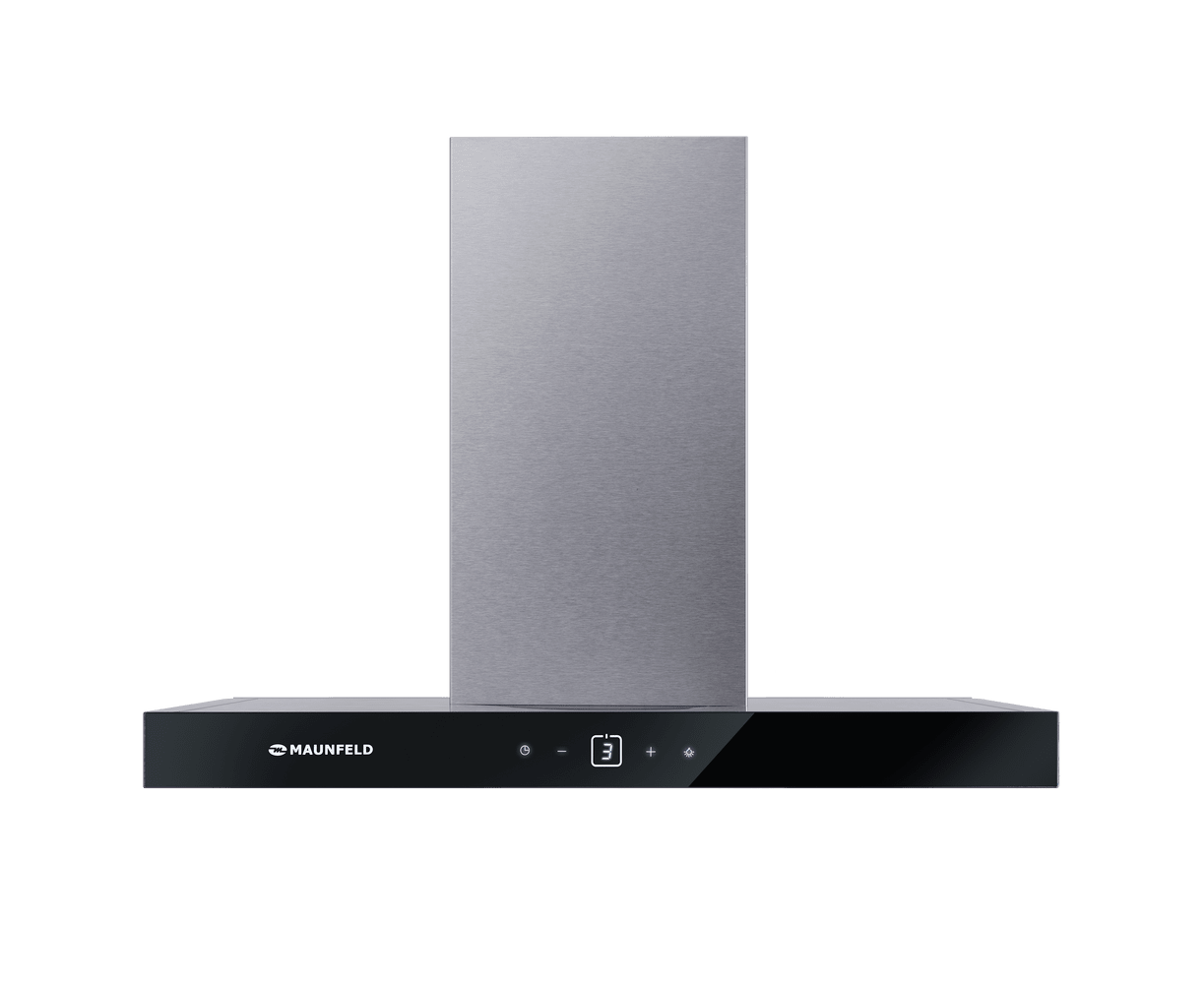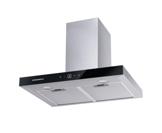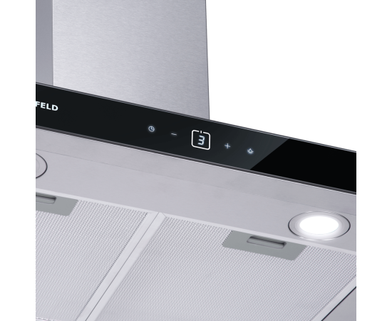 Сенсорная панель управления с дисплеем находится на фасаде, выполненном из закаленного стекла черного цвета. Можно выбрать один из 3-х скоростных режимов работы, установить таймер для выключения вытяжки и активировать светодиодную подсветку (2 светильника по 1,5 Вт).
