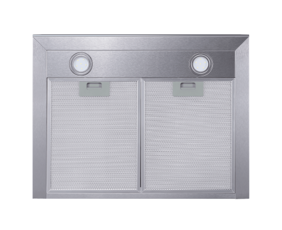 Вытяжка выполнена полностью из матированной нержавеющей стали. На рабочей поверхности расположено 2 многослойных жироулавливающих алюминиевых фильтра, которые легко вынимаются и полностью разбираются, что сильно упрощает чистку.