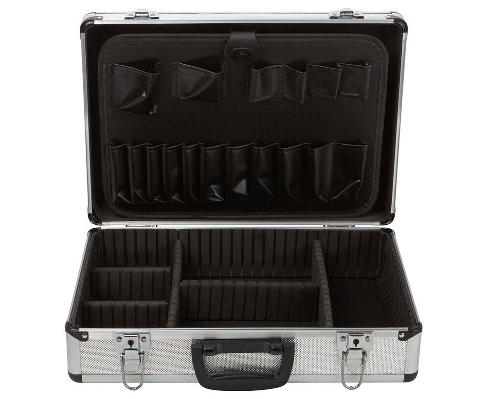 Ящик-чемодан предназначен для хранения и удобной транспортировки инструментов. Изготовлен из алюминия, а внутренняя отделка выполнена из мягкого пористого материала, что обеспечивает более бережное хранение инструмента. Переставные перегородки позволяют максимально эффективно использовать внутреннее пространство. Чемодан надежно закрывается с помощью металлических защелок. Удобная рукоятка обеспечивает комфортную переноску. Инструментальный ящик применяется как в профессиональной сфере, так и в быту: он очень вместительный, помогает упорядочить нужные в работе предметы и всегда держать их под рукой.