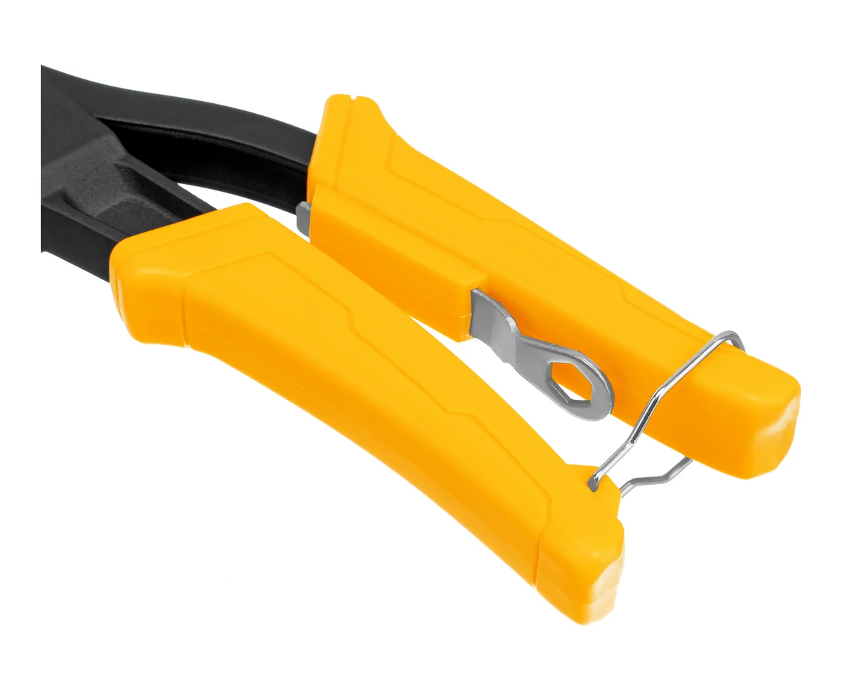 Усиленный ручной заклепочник Denzel 40441 длиной 255 мм, с литым корпусом, предназначен для работы с алюминиевыми вытяжными заклепками диаметром 2,4-3,2-4,0-4,8 мм, стальными диаметром 2,4-3,2-4,0 мм и вытяжными заклепками из «нержавейки» диаметром 2,4-3,2 мм. Инструмент позволяет соединять листовые металлические заготовки, металлопрофиль и легкие конструкции небольшой толщины. Используется для проведения строительных, ремонтных и монтажных работ как в быту, так и в профессиональной сфере.