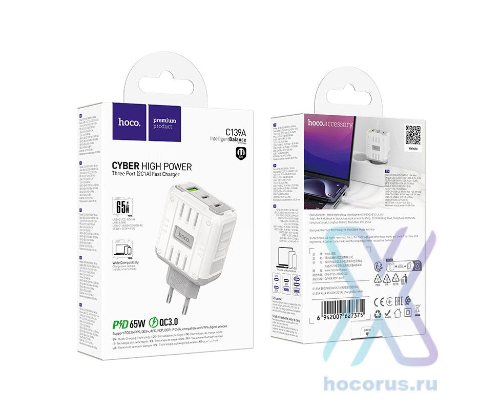 Зарядное устройство HOCO C139A Rock USB+2*USB-C, PD65W, белый