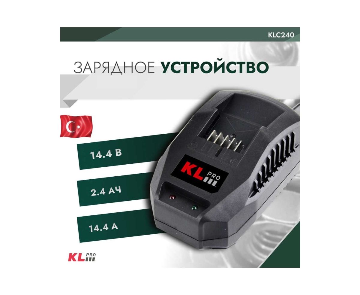 Зарядное устройство KLPRO KLC240 с максимальной потребляемой мощностью 14.4 А. Подходит для аккумуляторов, емкостью 2.4 Ач и напряжением 14.4 В. Работает от сети.