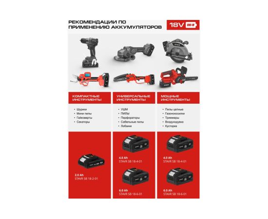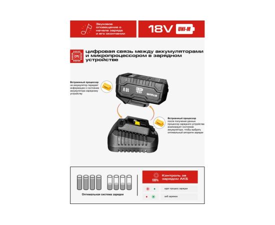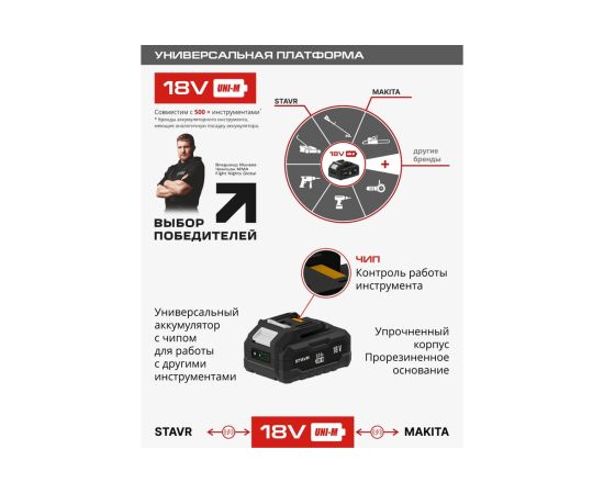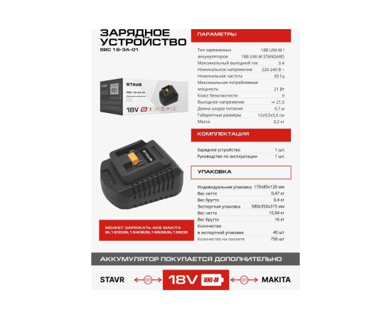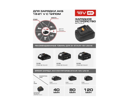 Зарядное устройство STAVR SBC 18-6A-01 — это универсальное решение для зарядки аккумуляторов 18V UNI-M. Это зарядное устройство поддерживает единую зарядную платформу и совместимо с более чем 500 инструментами различных брендов, что делает его идеальным выбором для владельцев разнообразного оборудования. Система защиты от перегрева, перегрузки и перезаряда обеспечивает безопасную и долговечную эксплуатацию. Быстрая зарядка 6 А\ч сокращает время ожидания, повышая продуктивность. Компактное и легкое устройство с массой всего 0,2 кг и длиной шнура 0,7 м легко использовать и переносить. Работает от сети 220-240 В, обеспечивая выходное напряжение 21,5 В при максимальном токе 6А. Зарядное устройство STAVR SBC 18-6A-01 — это надежность, безопасность и удобство в одном компактном корпусе.