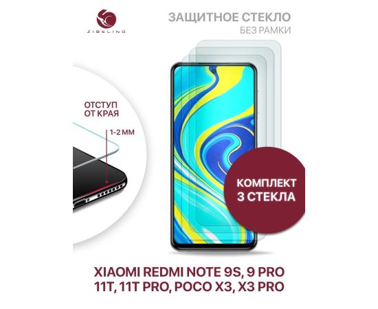 Защитное стекло (Комплект 3 шт) для Xiaomi 11T, 11T Pro, Redmi Note 9S, 9 Pro, Poco X3, X3 Pro, Poco X4 Pro 5G без рамки с отступом от краев, Ксиоми 11Т Про Редми Нот 9S 9 Про Поко Х3 Про Х4 Про 5G