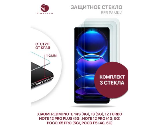 Защитное стекло (Комплект 3 шт) для Xiaomi Redmi Note 14S (4G) 2025, Note 13 (5G), Note 12 Pro (4G, 5G), 12 Pro Plus (5G), Note 12 Turbo, Poco X5 Pro (5G), Poco F5 (4G, 5G) без рамки, с отступом от краев, Редми Нот 12 Про Плюс Поко Х5 Про